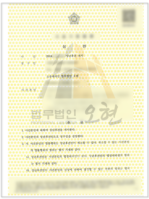 법원은 성년후견 개시를 인가하며, 의뢰인을 후견인으로 선임했습니다.이에 따라 의뢰인은 동생의 재산을 법적으로 보호하면서 각종 급여 수령, 복지시설 이용, 의료행위 동의 등을 적법하게 처리할 수 있게 되었습니다.