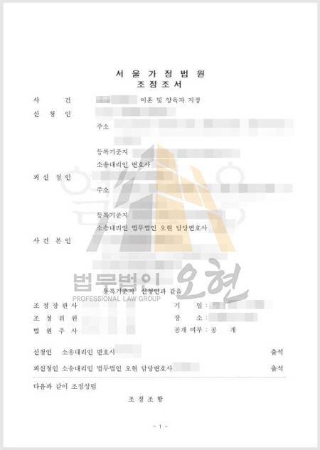 조정이 확정되면서 의뢰인은 이혼·면접교섭권만 확보하고 경제적 손실 없이 사건을 마무리했습니다.특히 임대사업 운영과 재산 규모가 큰 상대방과의 분쟁에서 재산분할을 둘러싼 장기 소송 리스크를 제거하고,양육비 부담이 발생하지 않는 형태로 이혼이 성립된 점에서 실익을 극대화한 사례입니다.