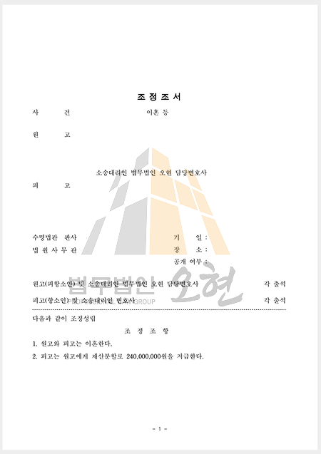 그 결과 재산분할금에 대하여 분할하여 임의로 지급하는 내용의 조정이 성립되었고, 이를 통해 의뢰인은 추가적인 집행이나 장기 소송 부담 없이 재산분할에 관한 권리를 안정적으로 확보할 수 있었습니다.