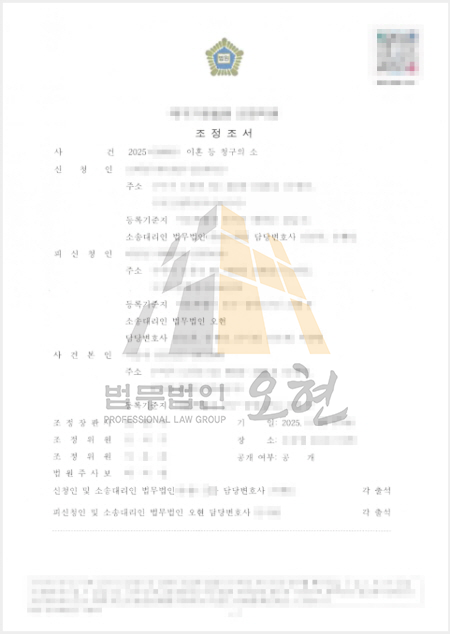 조정 결과, 상대방의 위자료 청구액은 대폭 감액되었고, 재산분할은 이루어지지 않았으며, 양육비 역시 법원 기준에 부합하는 수준으로 현실화되었습니다.이로써 의뢰인은 과도한 경제적 부담 없이 조정만으로 이혼을 종결할 수 있었습니다.