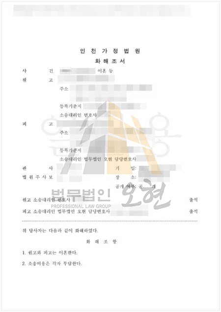 재판부 조정기일에서 이혼은 수용하되 위자료 및 재산분할, 양육비 등 일체 청구를 하지 않기로 합의하였고,소송비용 역시 각자 부담 조건으로 화해조서가 작성되어 의뢰인은 실질적 손해 없이 사건을 마무리할 수 있었습니다.