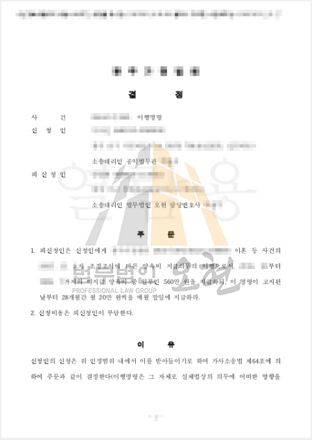 재산명시 및 이행명령 절차에서 본 법인의 신속하고 체계적인 대응 덕분에,상대방이 주장한 2,000만 원의 과다 청구 금액은 인정되지 않았고,실제 미지급 양육비 약 500만 원만 지급하도록 하는 내용으로 이행명령이 결정되었습니다.