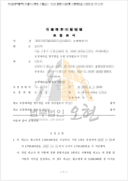 법원은 제출된 증거와 논리를 바탕으로 의뢰인이 청구한 금액 전액을 인정하는 조정조서를 작성했습니다.의뢰인은 장기간 소송 없이 단기간에 실질적 손해배상을 받을 수 있었고, 상대방도 조정 내용을 받아들여 추가 분쟁 없이 사건이 종결됐습니다.