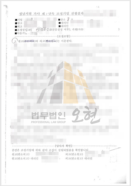 법원 조정기일에서 아래와 같은 조건으로 최종 조정이 성립되었습니다.- 자녀의 친권·양육권은 의뢰인에게 단독 귀속