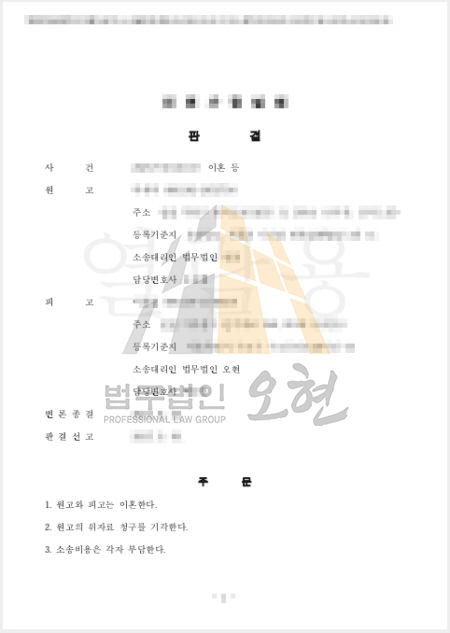 법원은 본 법인의 변론을 모두 받아들이고• 이혼은 인용• 위자료 청구는 전부 기각 판결을 선고했습니다.재판부는“갈등은 상호적이었고, 피고(의뢰인)의 행위가 불법행위로 평가되기 어렵다”고 판단했습니다.의뢰인은 금전적 부담 없이 사건을 종료해 새 출발을 준비할 수 있었습니다.