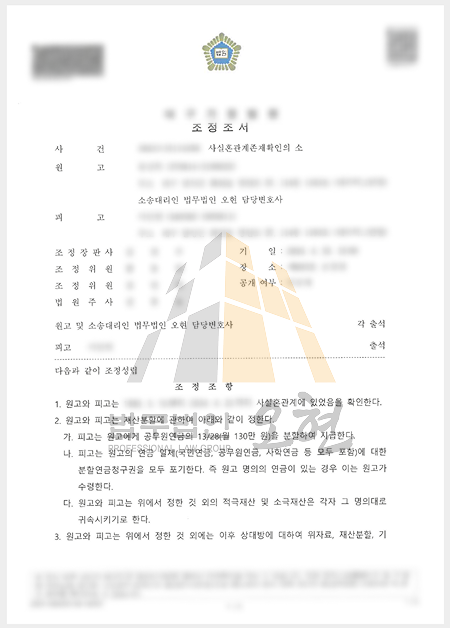 실익: 의뢰인은 이 조정 결정문을 근거로 연금공단에 직접 연금 분할을 청구할 수 있게 되었으며, 별도의 소송 없이도 노후 자금을 완벽하게 보장받게 되었습니다.