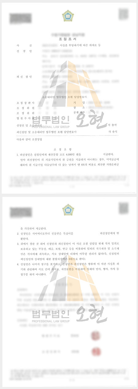 양측은 긴밀한 조율 끝에, 의뢰인이 상대방에게 재산분할금으로 4,000만 원만 지급하고, 상대방은 향후 위자료 등 어떠한 추가 청구도 하지 않는 것으로 조정이 성립되었습니다.